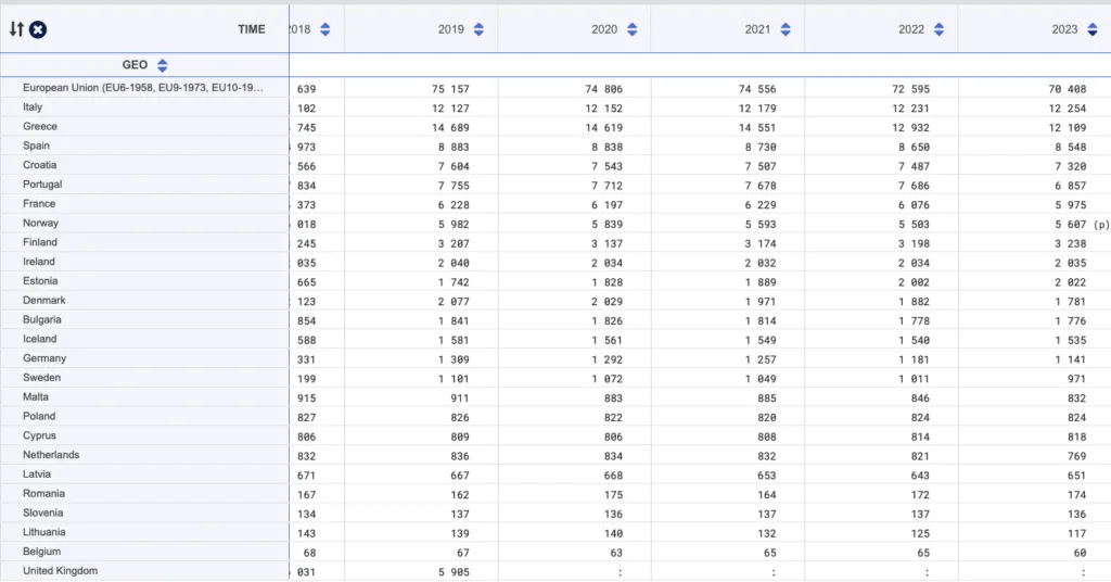 După numărul de vase, cea mai mare flotă din UE era în Italia (17,4% din toate vasele), urmată de Grecia (17,2%) și Spania (12,1%). Vasele italiene erau, în general, mici, cu o dimensiune medie de 11,9 tone brute (sub media UE de 18,0 tone brute), dar cu o putere a motorului de 77,3 kW, ușor peste media UE de 73,1 kW în 2023.