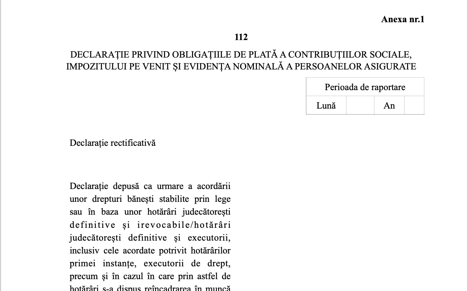 Agenția Națională de Administrare Fiscală (ANAF), în colaborare cu instituții cheie ale sistemului de protecție socială – Casa Națională de Pensii Publice (CNPP), Casa Națională de Asigurări de Sănătate (CNAS) și Agenția Națională pentru Ocuparea Forței de Muncă (ANOFM) – a lansat în consultare publică un proiect de ordin comun pentru aprobarea modelului actualizat al formularului 112, intitulat oficial „Declarație privind obligațiile de plată a contribuțiilor sociale, impozitului pe venit și evidența nominală a persoanelor asigurate”.