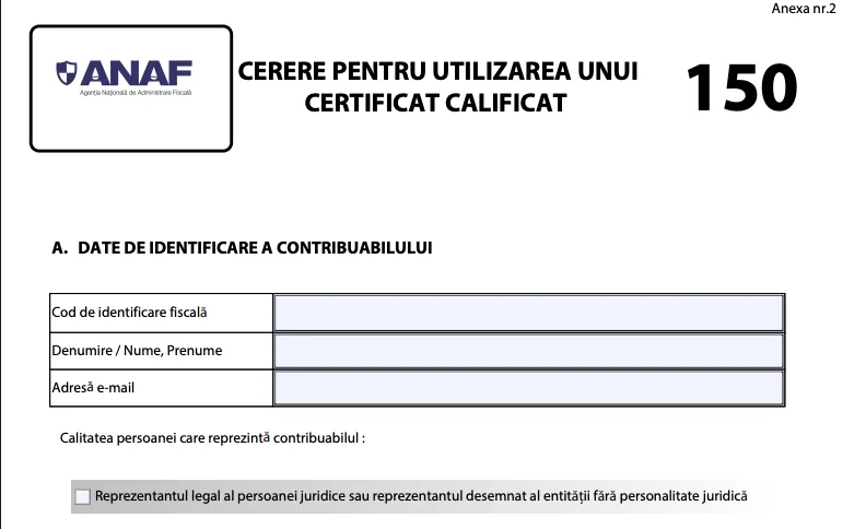 Formularul 150 „Cererea pentru utilizarea unui certificat calificat” se completează utilizând ficționalitățile disponibile în serviciul „Depunere declarații on-line”. Cererea este transmisă electronic de către contribuabil sau de către reprezentantul/împuternicitul acestuia, purtând o semnătură electronică calificată, către organul fiscal competent.
