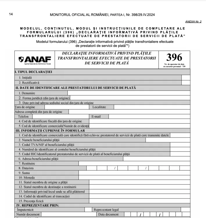 Noul model al Formularului 396 este necesar pentru ca Agenția Națională de Administrare Fiscală (ANAF) să se adapteze mai ușor la normele Uniunii Europene. Formularul 396 se referă la „Declarație informativă privind plățile transfrontaliere efectuate de prestatorii de servicii de plată”.