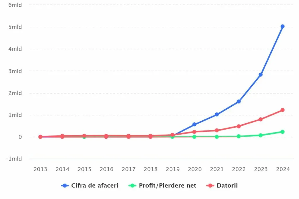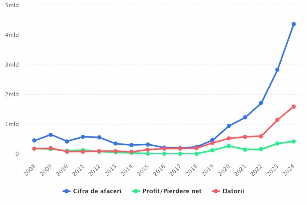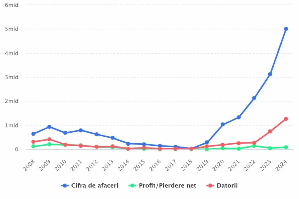 Pe lângă această performanță excepțională în ceea ce privește cifra de afaceri, compania a raportat un profit net de 229 milioane lei în 2024, ceea ce indică o eficiență operațională foarte bună, în special având în vedere faptul că firma are doar 4 angajați declarați. Acest număr extrem de redus sugerează fie un model de afacere bazat pe subcontractare către alte companii din grup, fie o raportare specifică de tip holding. De fapt, angajații din grup sunt deținuți de firma Spedition UMB, companie care nu a depus încă bilanțul pe 2024.