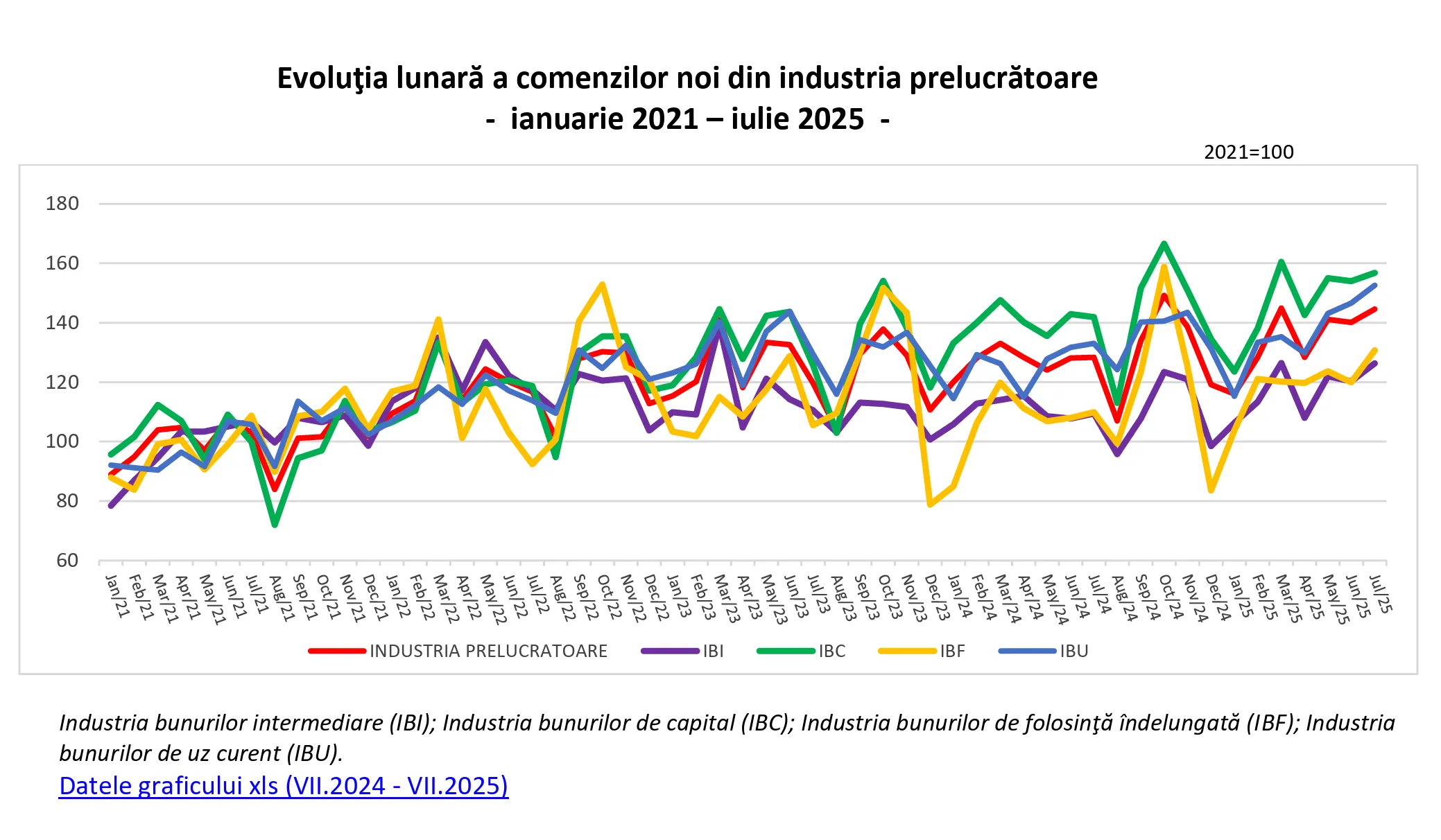 Comenzile noi din industria prelucrătoare românească au crescut cu 6,0% în primele șapte luni ale 2025 față de aceeași perioadă din 2024, cu o accelerare notabilă în iulie (+12,6% an/an), conform datelor publicate de INS. Toate categoriile industriale au înregistrat evoluții pozitive, industria bunurilor de folosință îndelungată conducând cu +12,4%.