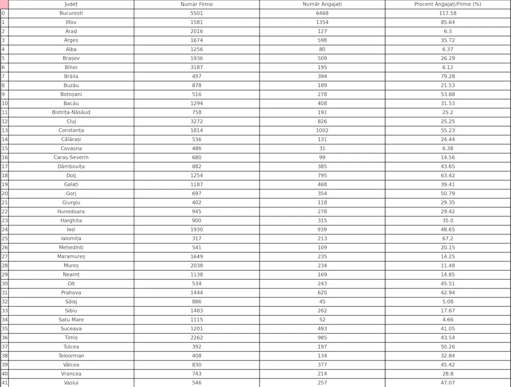 - Timiș - 2.262 de firme care au avut 985 de angajați. Procentul angajaților la număr de societăți a fost de 43.54%.