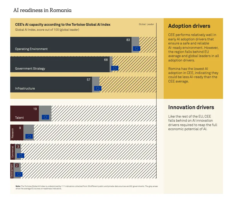 Studiul Google arată că doar 4% dintre companiile din CEE și 2% dintre cele din România au adoptat cel puțin un tip de tehnologie AI în 2023, față de media de 8% în UE. Cu toate acestea, 40% dintre întreprinderile din România plănuiesc să investească în automatizarea bazată pe AI în următorii cinci ani. Principalul obstacol în calea adoptării AI, menționat de 61% dintre companiile din CEE, este costul instrumentelor AI. În ansamblu, CEE este în urma mediei UE și a liderilor globali pe toți factorii de adoptare și trebuie să valorifice beneficiile AI prin strategii guvernamentale direcționate, investiții în abilități și educație în domeniu, sprijin pentru inovația locală și inițiativele comerciale în domeniul AI.