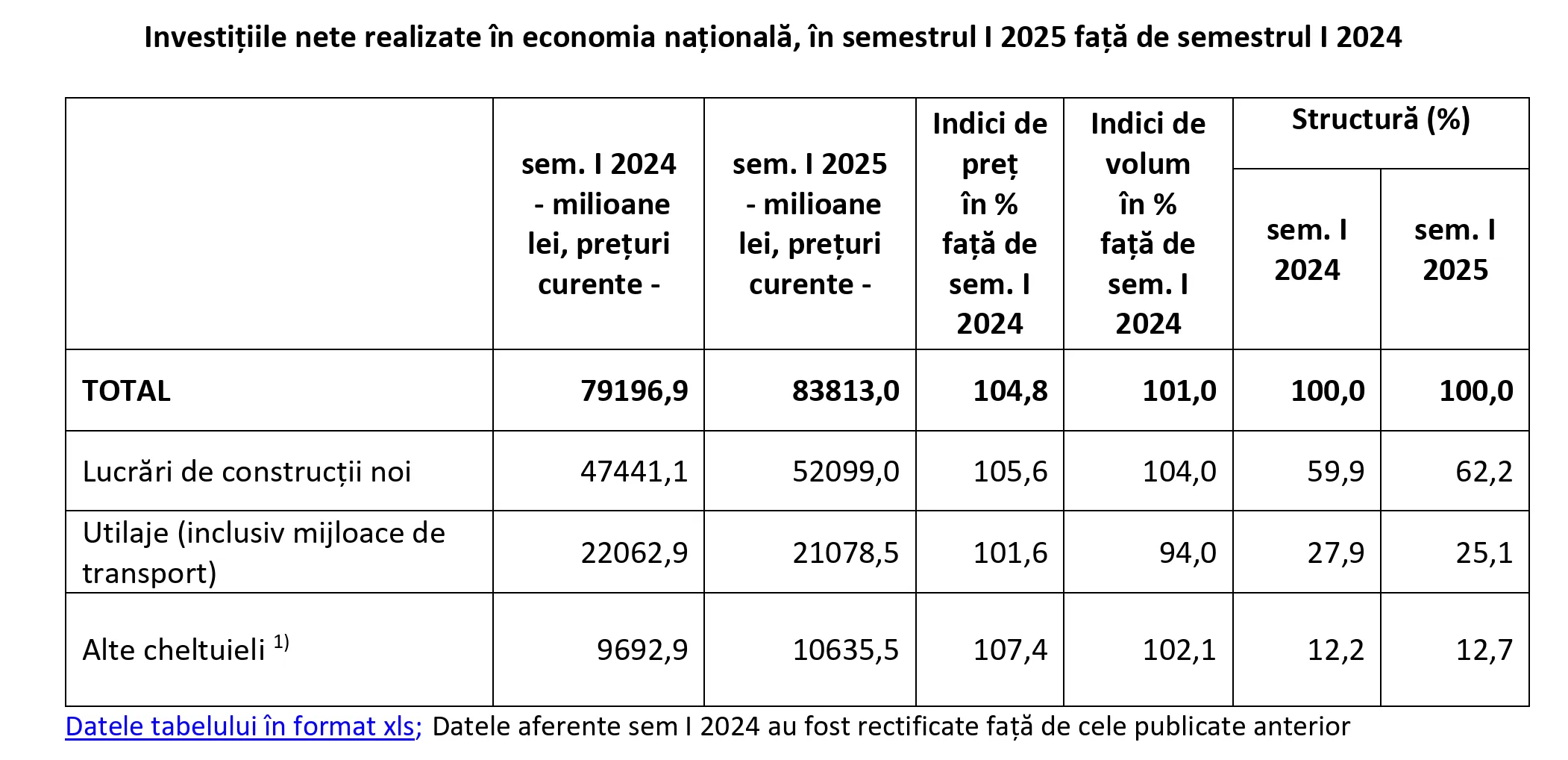 Analiza structurii investițiilor relevă o concentrare tot mai mare pe lucrări de construcții noi, care au ajuns să reprezinte 62,2% din totalul investițiilor (versus 59,9% în 2024). Această categorie a crescut cu +4,0% în semestrul I, atingând 52,1 miliarde lei.
