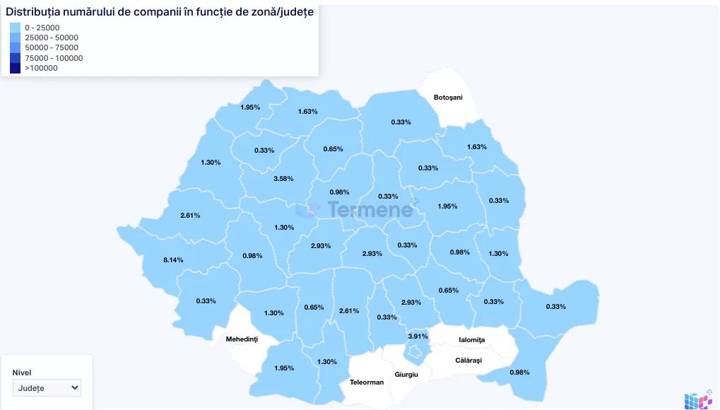 Cum era poate de așteptat, majoritatea acestor companii se află în marile orașe înregistrate cu sediul social. 277 de firme din cele 6.984 sunt din mediul urban. În mediul rural se găsesc alte 1.400 de societăți comerciale.