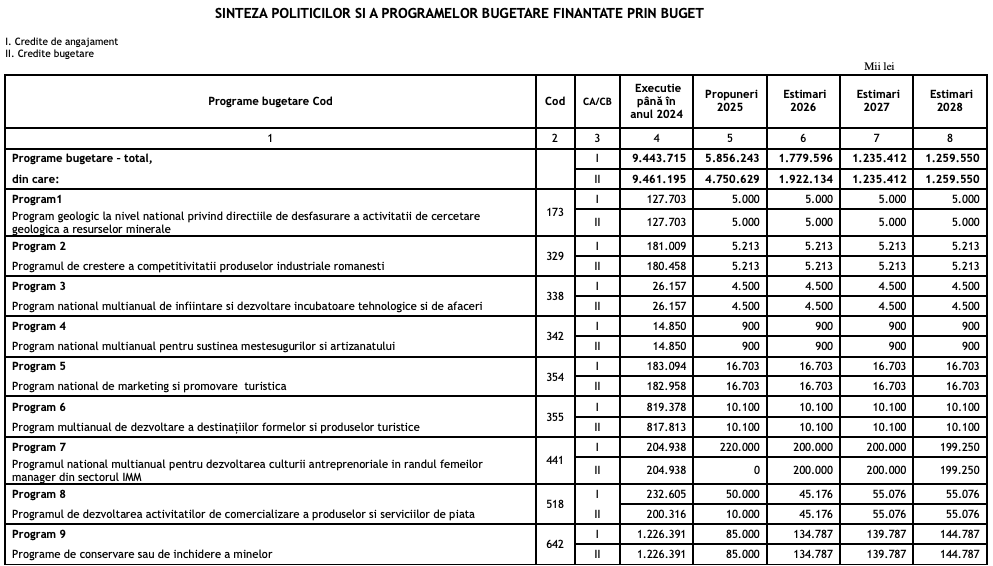 - Programul național pentru stimularea creării, dezvoltării și promovării brandurilor sectoriale – nu are finanțare propusă pentru 2025.