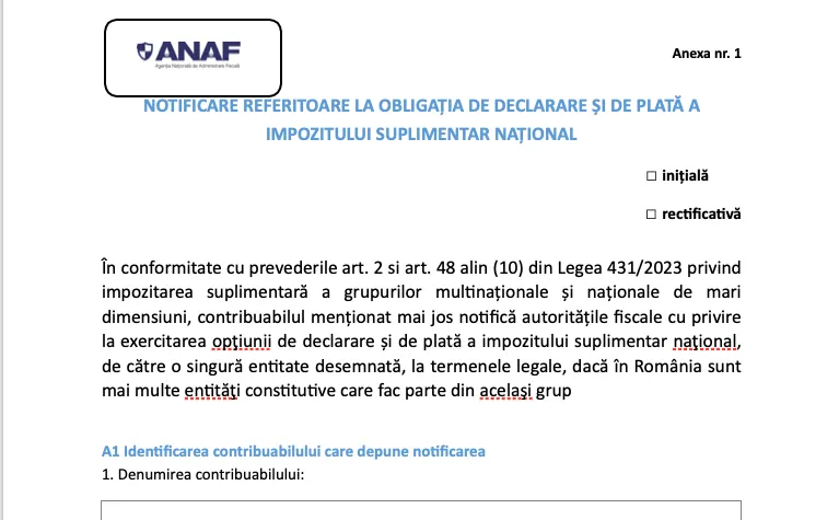- Se aprobă modelul şi conținutul formularului ”Notificare referitoare la obligația de declarare și de plată a impozitului suplimentar național”, prevăzut în anexa nr. 1.