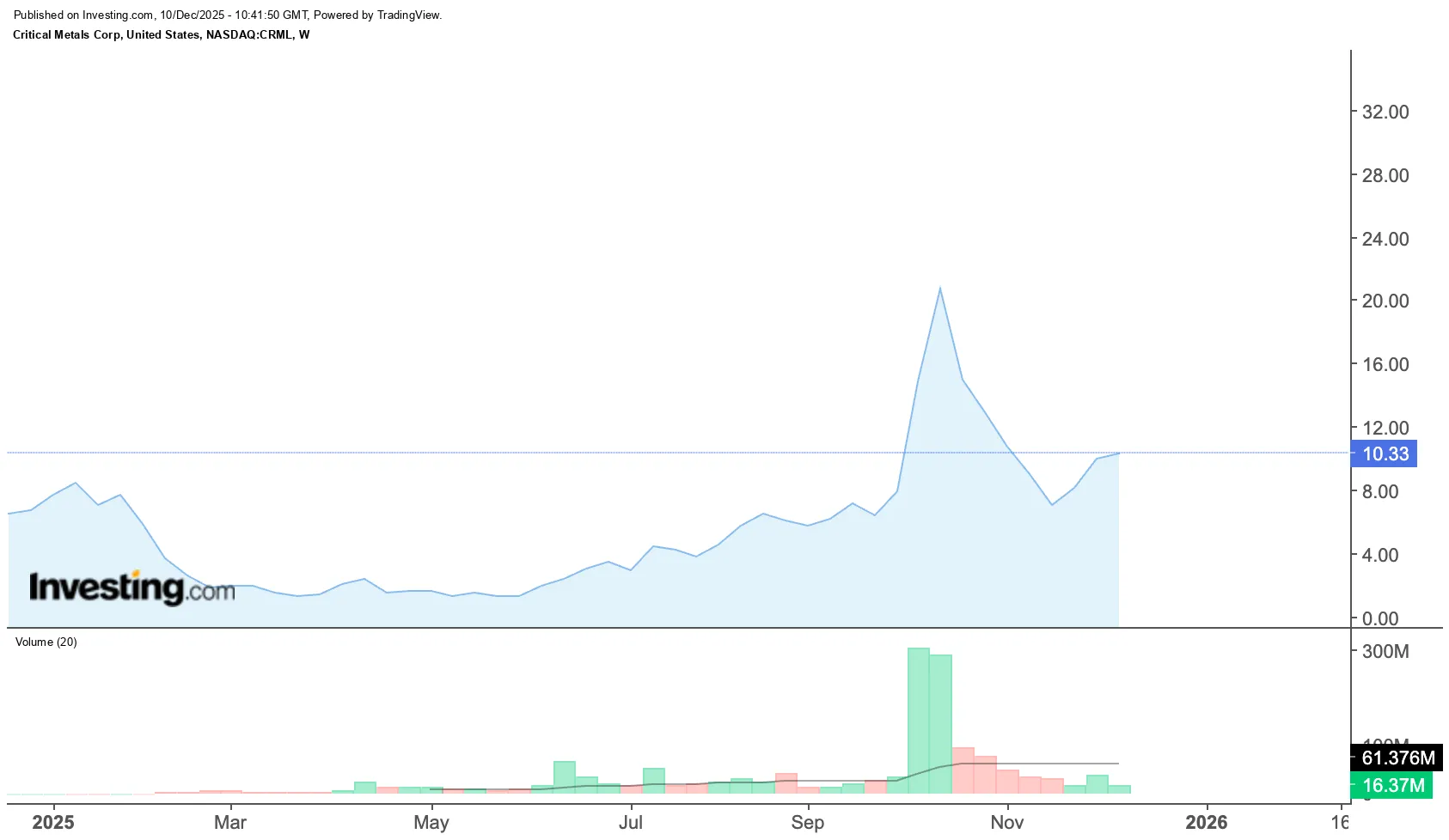 Critical Metals Corp este listată pe piața de tehnologie NASDAQ a bursei americane, unde este evaluată de investitori la peste 1 mld. dolari. În ultimul an, acțiunile CRML înregistrează o apreciere de 34,5%, conform datelor Investing.com.