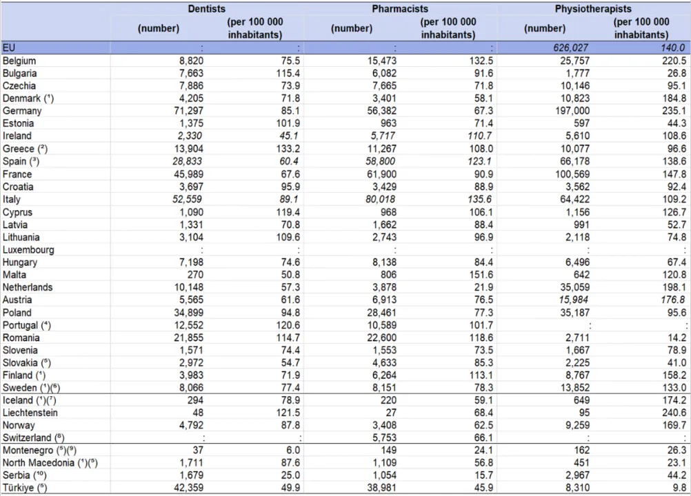 În Uniunea Europeană, România ocupă poziții variate în ceea ce privește distribuția dentiștilor, fizioterapeuților și farmaciștilor raportat la populație, conform datelor din 2022.