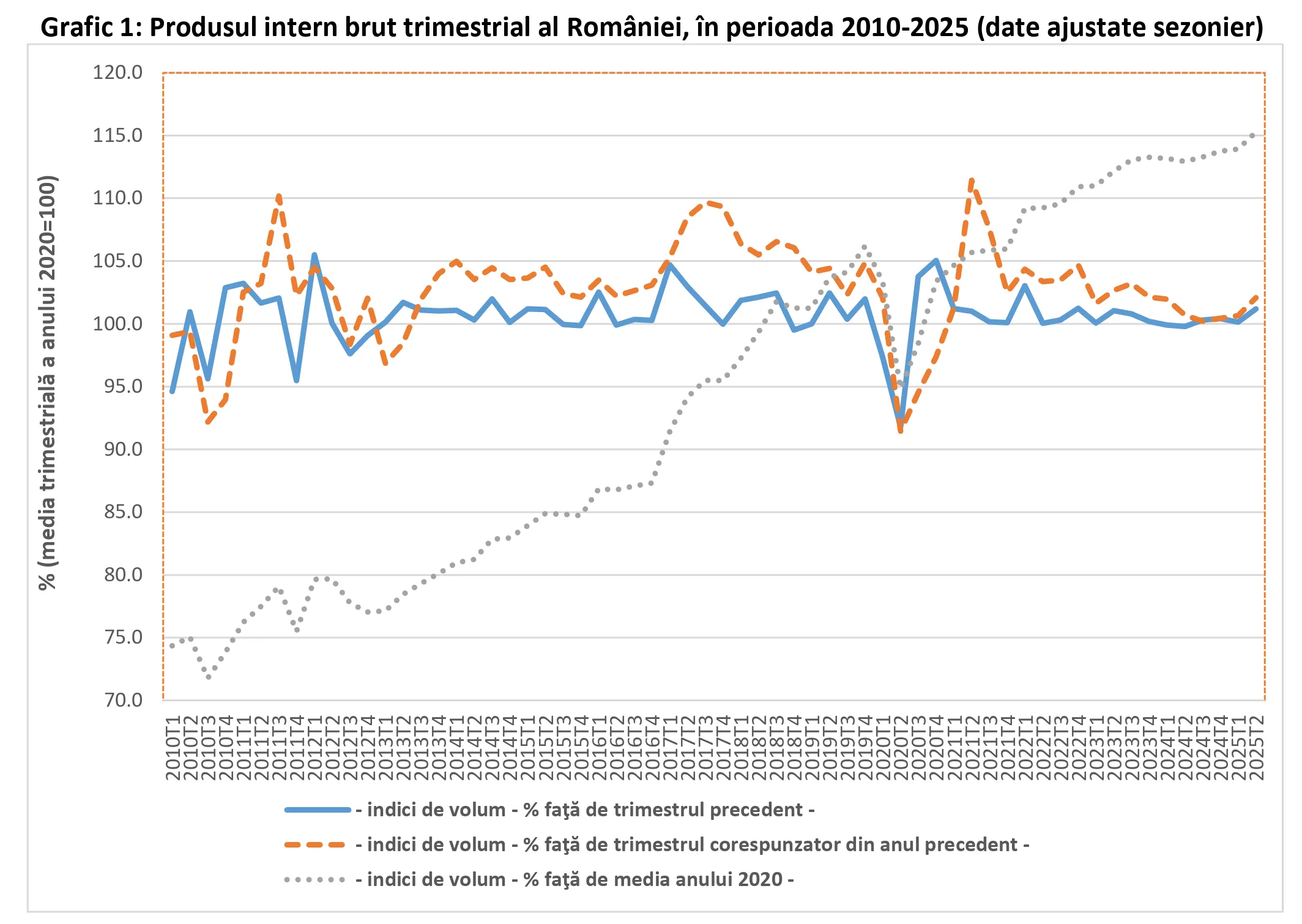 - PIB trimestrul II 2025: 450,5 miliarde lei (serie brută), +0,3% față de T2 2024