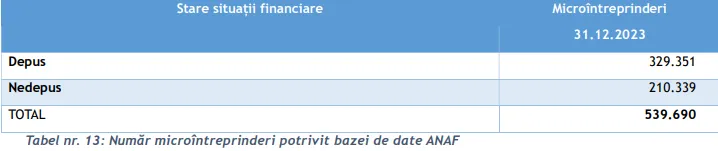 329.351 e microîntreprinderi au depus situațiile financiare prevăzute de lege, în timp ce 210.339 de contribuabili microîntreprinderi la 31.12.2023 nu au depus situațiile financiare pentru anul 2023 (termenul legal – 29.05.2024), fapt ce va conduce, conform regulilor de determinare a condițiilor de aplicare a sistemului de impunere a veniturilor microîntreprinderilor, introduse prin OUG nr. 115/2023, la modificarea regimului fiscal și încadrarea acestor contribuabili la regimul fiscal de impozit pe profit.