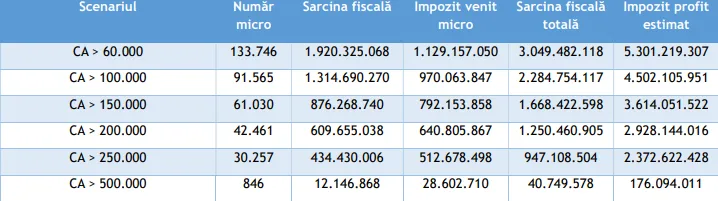 Potrivit scenariilor analizate, reducerea pragului de eligibilitate pentru microîntreprinderi și menținerea condiției de a avea un salariat ar putea crește veniturile fiscale de la nivelul actual de 6 miliarde lei, până la un maxim teoretic de 8,1 miliarde lei, generând un plus de aproximativ 2,1 miliarde lei.