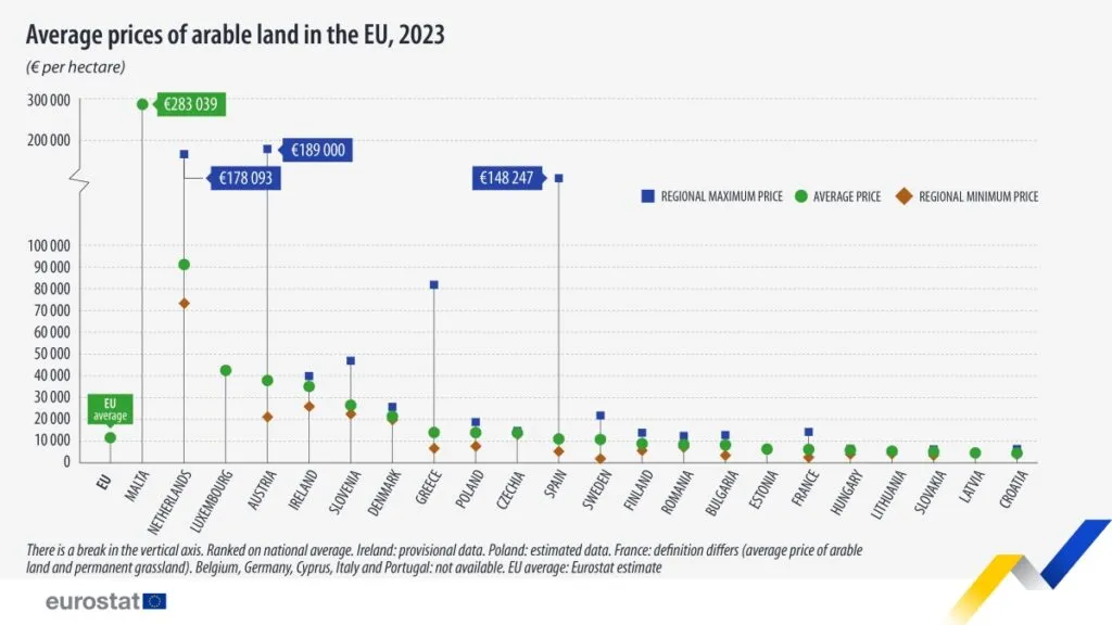 Dintre cele 22 de țări ale UE cu date disponibile, cel mai ridicat preț mediu pentru un hectar de teren arabil a fost înregistrat în Malta, unde a ajuns la 283.039 de euro pe hectar. Următoarele cele mai ridicate prețuri au fost în Olanda (91.154 de euro pe hectar) și Luxemburg (42.540 de euro pe hectar).