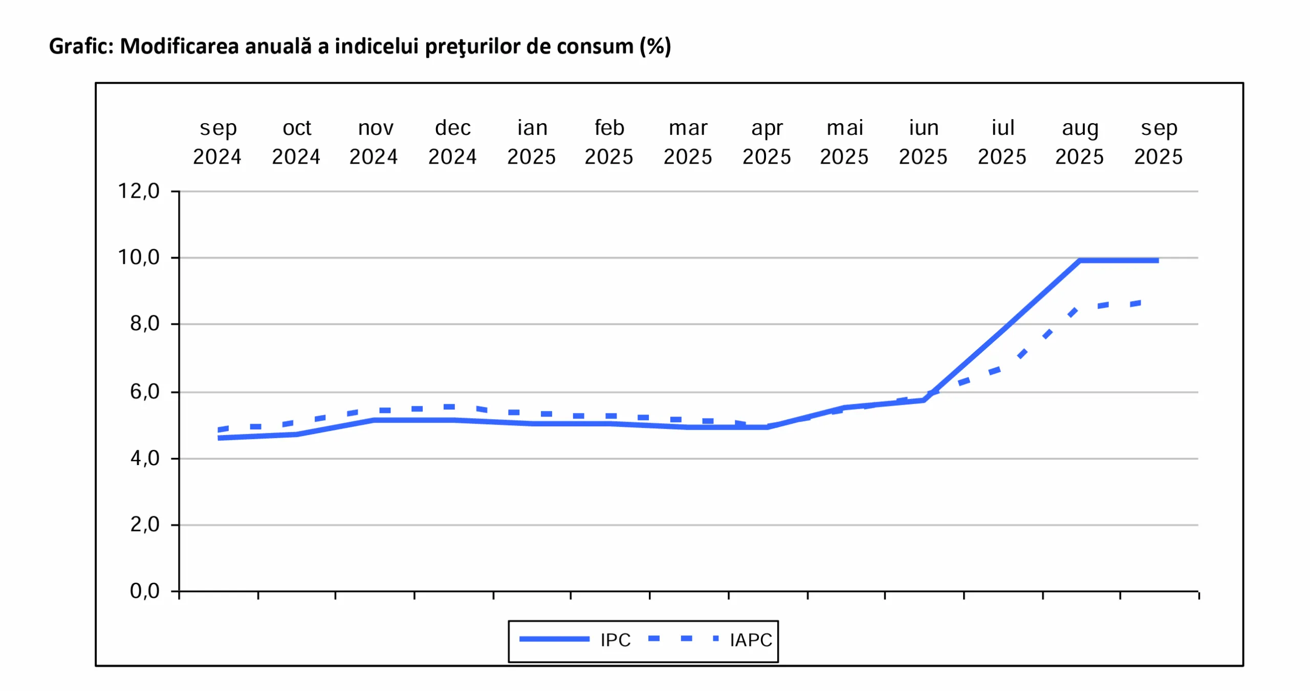 Rata anuală a inflației a ajuns la 9,9% în septembrie 2025, de la 9,7% în august, marcând o accelerare a creșterii prețurilor determinată în principal de liberalizarea pieței energiei electrice și majorarea TVA-ului la 21%. Mărfurile nealimentare s-au scumpit cu +11,1% față de aceeași lună a anului trecut, serviciile cu +10,4%, iar alimentele cu +7,9%, conform datelor Institutului Național de Statistică (INS).