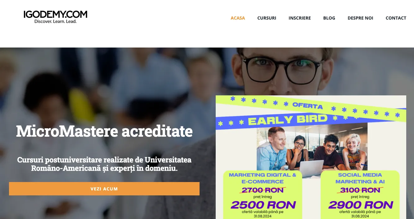 Scopul cursurilor igodemy.com este de a ajuta profesioniştii, managerii şi întreprinzătorii să îşi îmbunătăţească cunoştinţele pentru a înţelege şi răspunde provocărilor inteligenţei artificiale şi a o utiliza astfel la potenţialul maxim. Cursurile sunt oferite în parteneriat cu Universitatea Româno-Americană
