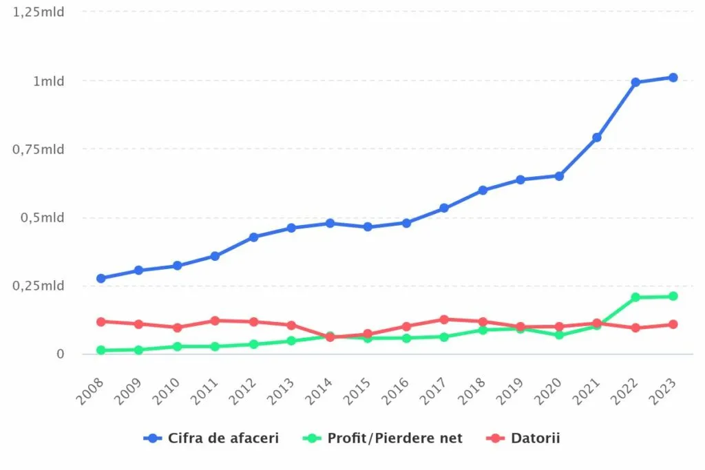 Asta după ce în anul precedent, în 2022, cifra de afaceri a fost de 991 de milioane de lei. Creșterea de la an la an a fost de 1%.