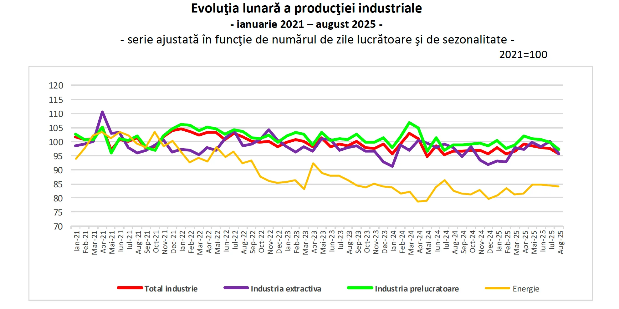 Producția industrială din România a înregistrat o scădere de 0,7% în perioada ianuarie-august 2025 comparativ cu aceeași perioadă a anului trecut, conform seriei ajustate de INS. Declinul este condus de industria prelucrătoare și industria extractivă, ambele în scădere cu 0,9%, în timp ce sectorul energetic oferă singura notă pozitivă cu o creștere de 1,0%.
