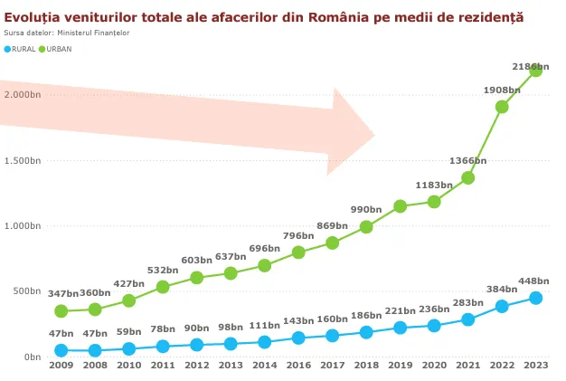 Între 2021 și 2023, veniturile totale au crescut cu 60%, însă profitul în mediul rural a avansat cu doar 39%, comparativ cu o creștere de 57% în mediul urban.