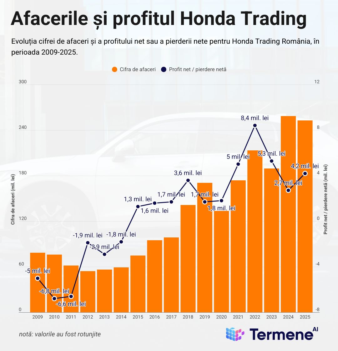 Mai exact, Honda Trading România SRL (RO18812639) a avut un profit net de aproape 4,2 mil. lei în 2025, în creștere cu 55% față de anul 2024.
