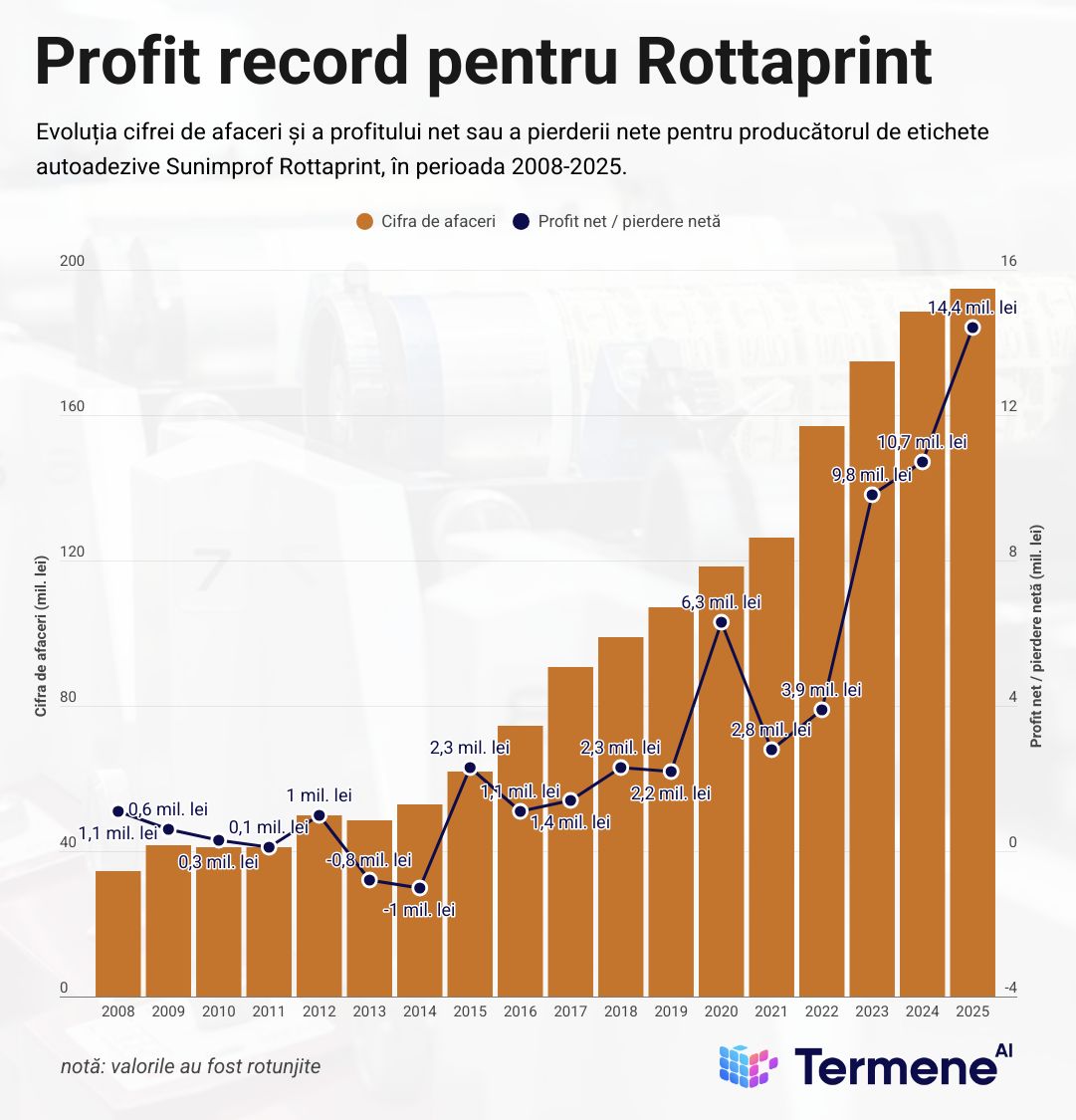 Mai exact, firma Sunimprof Rottaprint SRL (RO7096283) a avut un profit net de 14,4 mil. lei în 2025, în creștere cu 35% față de anul 2024, marcând al zecelea an consecutiv de profitabilitate, chiar dacă nivelul profitului a înregistrat fluctuații.