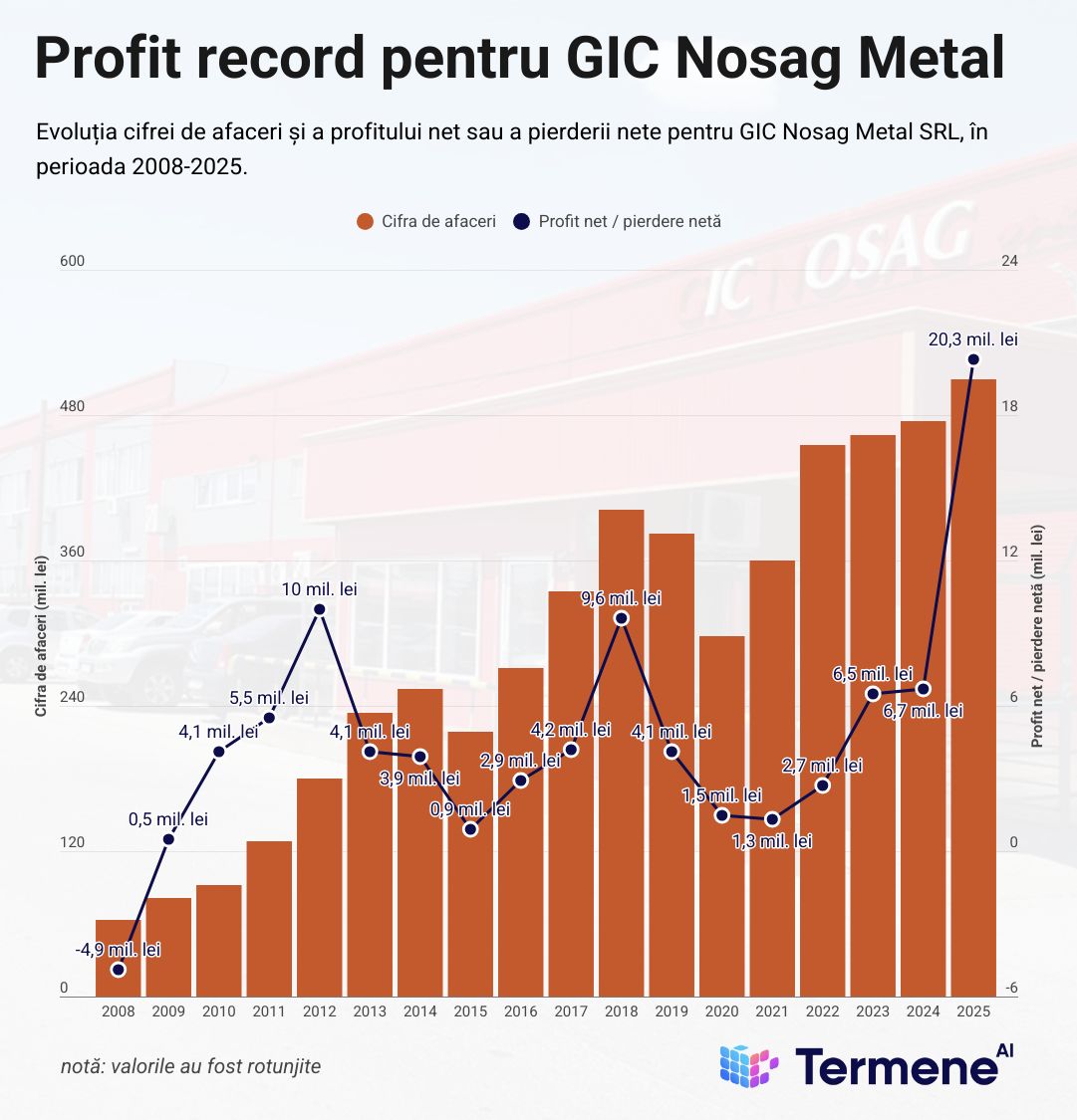 Mai exact, GIC Nosag Metal SRL (RO16939009) a avut afaceri de 509,6 mil. lei în 2025, în creștere cu 7% față de anul 2024. Cifra de afaceri a reintrat pe o traiectorie ascendentă începând cu anul 2021, după scăderi în perioada 2019-2020.