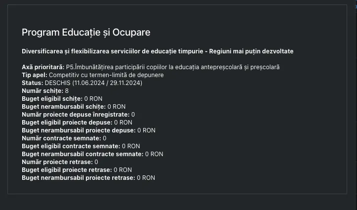MIPE a prelungit termenul de depunere a proiectelor care solicită finanțarea pentru construcția de creșe și grădinițe până pe 29 noiembrie. Este vorba programul „Diversificarea și flexibilizarea serviciilor de educație timpurie - Regiuni mai puțin dezvoltate”. Decizia conducerii ministerului a luat această decizie pentru a permite depunerea proiectelor. În acest moment, în platformă sunt începute 8 schițe de proiecte de finanțare. Asta nu înseamnă că toate aceste schițe vor ajunge să fie proiecte depuse pentru finanțare.