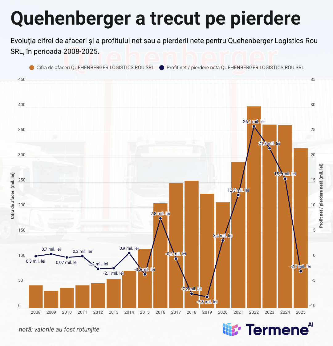 - Compania a înregistrat o pierdere netă de 2,7 mil. lei în 2025, comparativ cu un profit net de 15,7 mil. lei în 2024. Quehenberger Logistics a trecut pe pierdere pentru prima dată în șase ani.