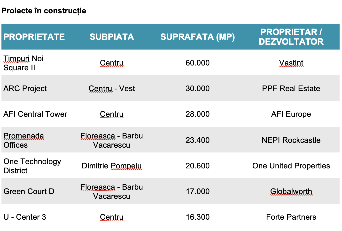 Celelalte proiecte în construcție sunt ARC Project în zona Grozăvești-Politehnica, al grupului ceh PPF Real Estate, cu 30.000 metri pătrați; Promenada Offices, cu 23.400 metri pătrați dezvoltat de NEPI Rockcastle parte a extinderii Promenada Mall din subzona Floreasca-Barbu Văcărescu; proiectul One Technology District, în zona Dimitrie Pompeiu, cu 20.600 metri pătrați al celor de la One United Properties.