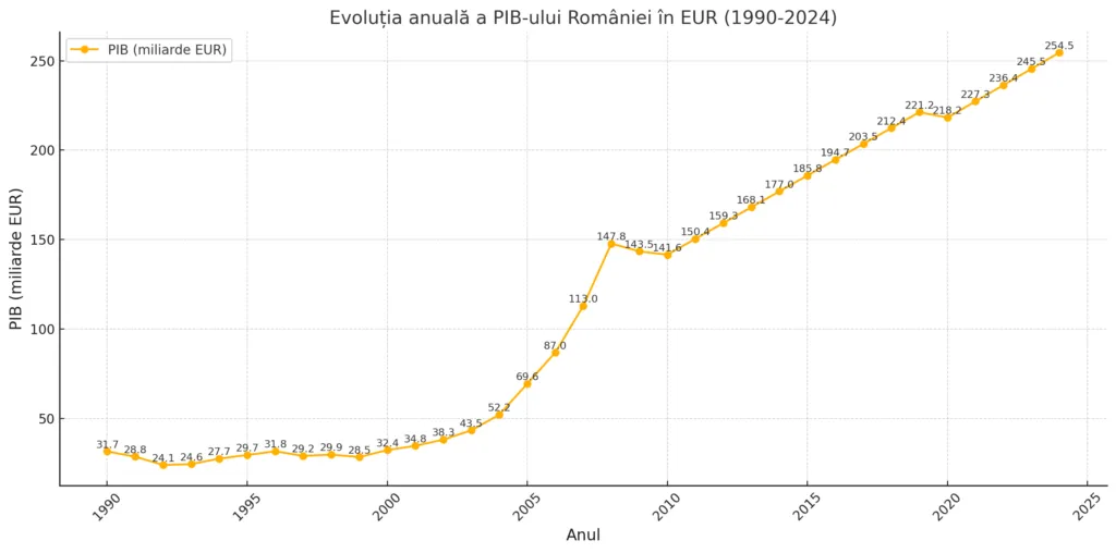 Între 1990 și 2024, Produsul Intern Brut (PIB) al României a evoluat semnificativ, reflectând tranziția de la economia centralizată la cea de piață. Dacă în 1990, PIB-ul era de 31,7 miliarde de euro, în 2024 acesta este de așteptat să ajungă la 245,5 miliarde de euro, ceea ce reprezintă o creștere de 8 ori.