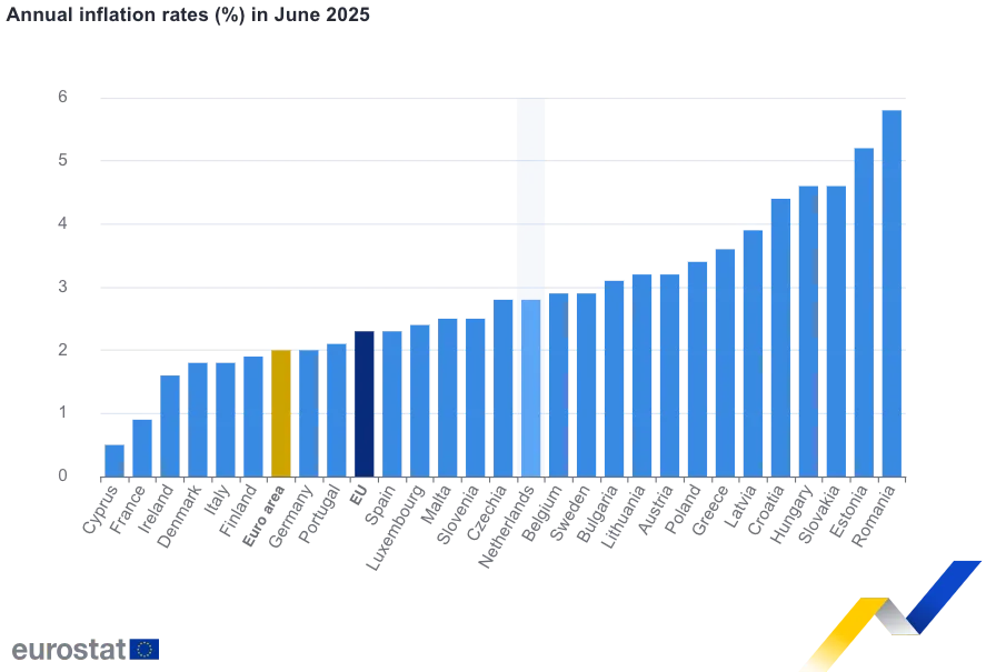 Rata anuală a inflației în zona euro a fost de 2,0% în iunie 2025, în creștere față de 1,9% în mai. Cu un an în urmă, rata era de 2,5%.