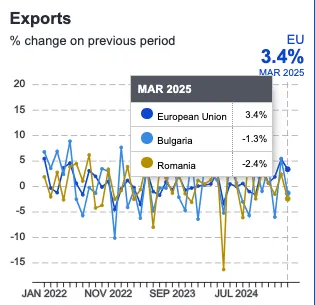 Bulgaria a înregistrat o scădere a producției industriale în martie de 3,6% față de luna precedentă. România a înregistrat tot o scădere, dar mai mică, a producției industriale de 0,5% în luna martie 2025 raportat la luna februarie din 2025. Media UE a fost de plus 1,9%.