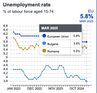 România are o rată a șomajului de 5,5% în luna martie în rândul populației între 15 și 74 de ani. Rata din Bulgaria este de doar 3,8%, țară care are o rată a șomajului mai mică decât cea din țara noastră.