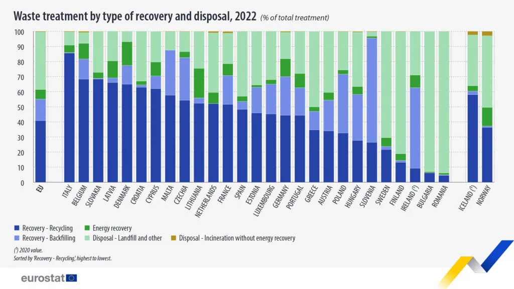 S-au observat diferențe considerabile între țările UE în utilizarea metodelor de tratare a deșeurilor. Italia a înregistrat cel mai mare procent de reciclare, cu 85,6%, urmată de Belgia și Slovacia, ambele cu 68,3%. În contrast, depozitarea în gropi de gunoi și alte metode de eliminare au dominat în România (93,8%), Bulgaria (93,0%) și Finlanda (81,0%).