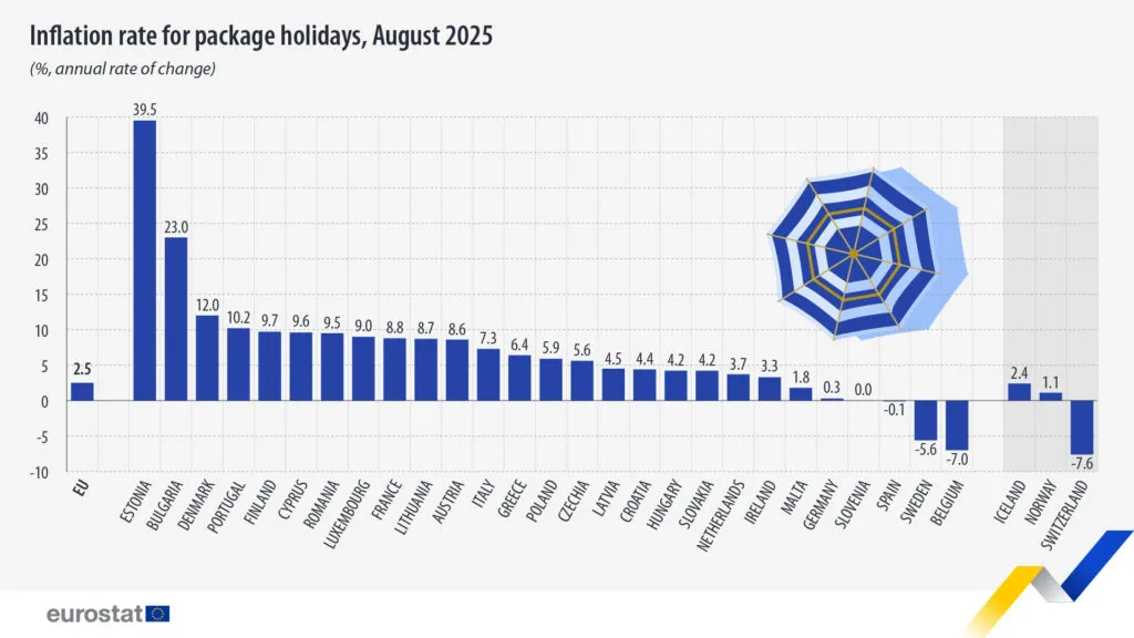 În august 2025, cele mai mari creșteri de preț au fost înregistrate pentru pachetele de vacanță vândute în Estonia, unde prețurile au crescut cu 39,5% comparativ cu august 2024. Bulgaria a urmat cu o creștere de 23,0%, iar Danemarca cu 12,0%.