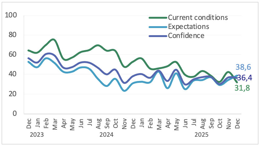 Astfel, componenta de anticipații a crescut cu 4,4 puncte, până la valoarea de 38,6, participanții anticipând continuarea politicilor de reducere a deficitului bugetar, însă componenta de condiții curente a scăzut cu 10,6 puncte, în condițiile scăderii puternice a consumului în octombrie și noiembrie.