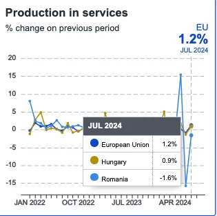 Producția de servicii în UE a revenit la creștere lunară în iulie 2024, inversând scăderea observată în iunie 2024. O perspectivă mai amplă a variațiilor de la o lună la alta arată o tendință pozitivă pentru sectorul serviciilor, culminând cu o creștere anuală mai pronunțată în iulie 2024.