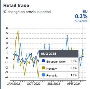 România a înregistrat o creștere a comerțului cu amănuntul de 1,6% față de 0,8% cât s-a înregistrat în țara vecină.