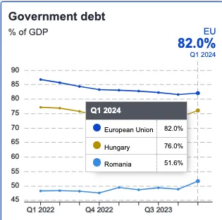 România, pentru că are o datorie guvernamentală de 51,6% din propriul PIB. Ungaria are datorii de 76% din PIB. De altfel, țara noastră stă bine și în ceea ce privește media europeană.