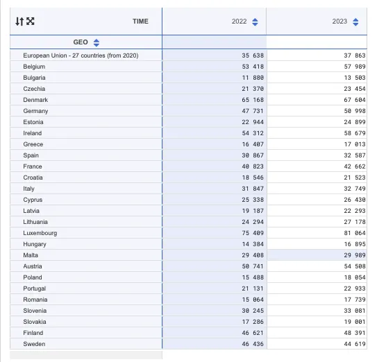 În 2023, salariul anual ajustat pentru normă întreagă al angajaților din Uniunea Europeană a fost de 37.900 de euro, reflectând o creștere de 6,5% față de 35.600 de euro în 2022.