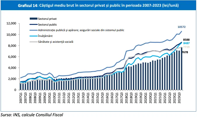 „Considerând medii trimestriale, salariul mediu brut lunar în sectorul public aferent trimestrului IV al anului 2023 a înregistrat un nivel de 8.588 lei, cu 16,4% mai mult decât în aceeași perioadă din anul 2022, în timp ce salariul din sistemul privat a fost de 7.678 lei, în creștere tot cu 16,4% față de trimestrul IV al anului 2022”, se transmite în raportul Consiliului Fiscal.