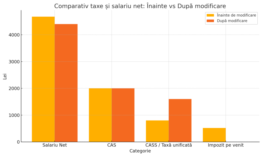 Astfel, în urma modificării ipotetice, salariatul ar plăti taxe mai mari cu 280 de lei, iar salariul net ar scădea cu aceeași sumă. Totuși, valoarea exactă a taxei unificate ar depinde de deciziile guvernului.