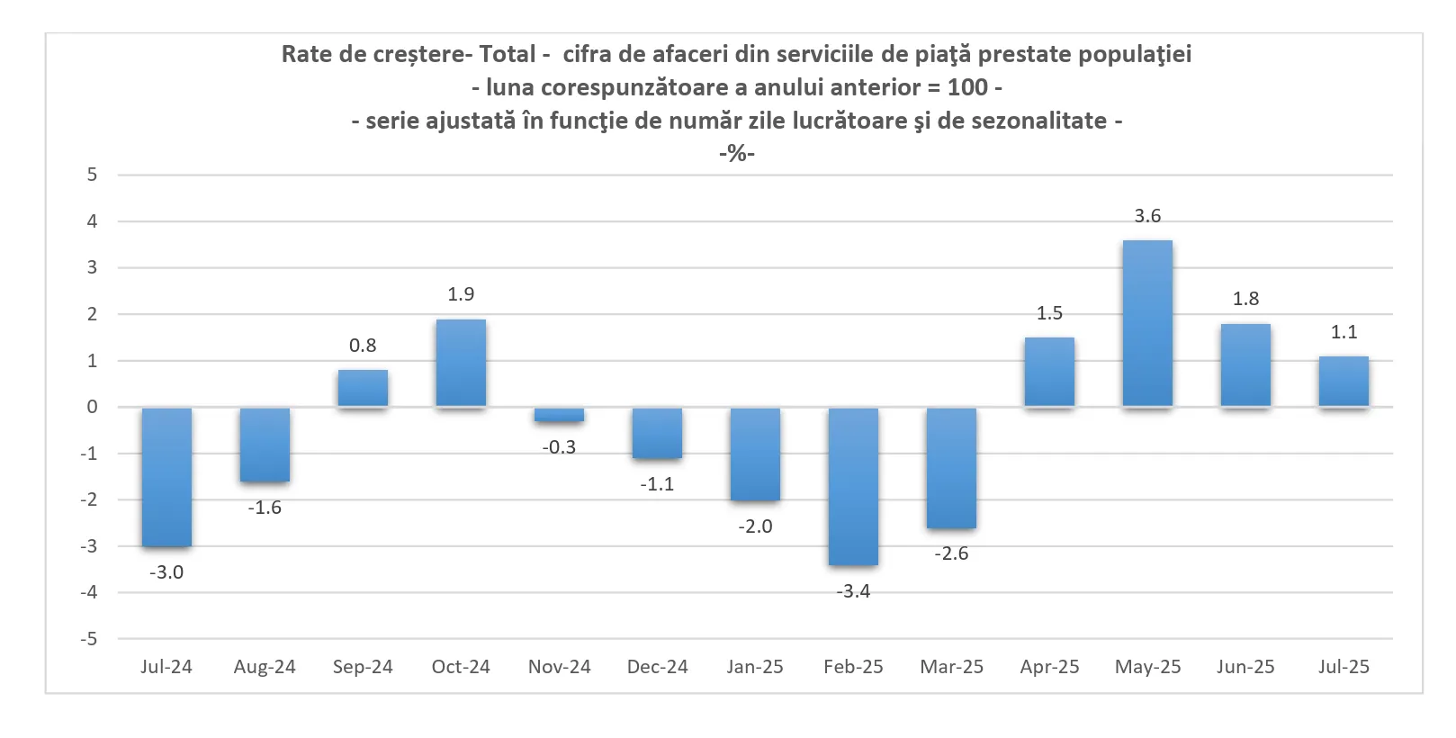 Serviciile de piață prestate populației au crescut cu +8,5% în iulie 2025 față de iunie, susținute de hoteluri și restaurante (+11,1%), însă ritmul de creștere față de iulie 2024 a încetinit la doar +0,9%. Pe primele șapte luni din 2025, avansul este marginal (+0,3% față de aceeași perioadă din 2024), indicând o stagnare a consumului de servicii în economia românească.