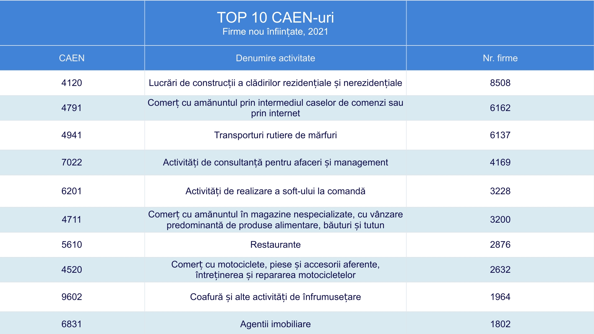 Din cele 111.095 de firme noi, cele mai multe sunt de construcții (CAEN 4120) – 8.508 de astfel de societăți. Pe locul 2 sunt cele cu cod CAEN 4791 – Comerț cu amănuntul prin intermediul caselor de comenzi sau prin internet (6.162), urmate de cele de transport (6.137).