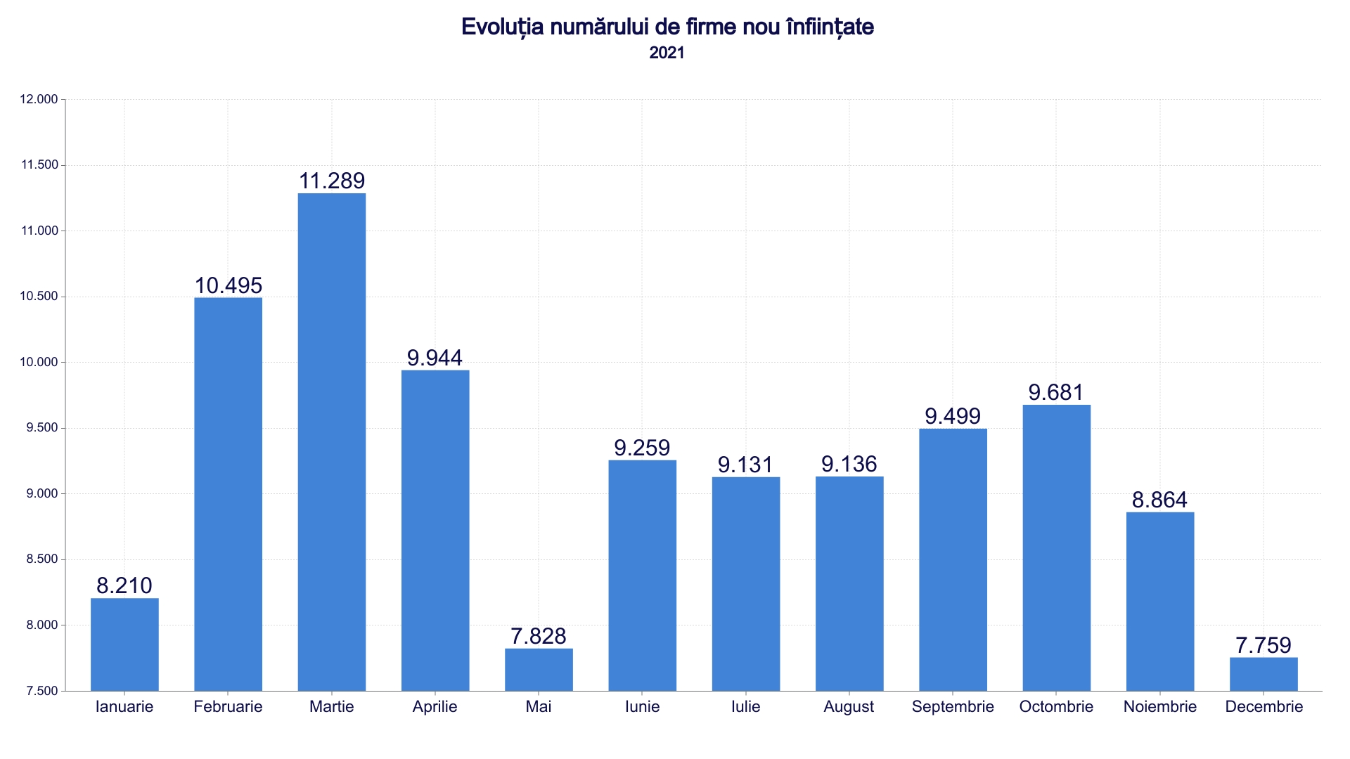 Cele mai multe firme au fost înființate în luna martie (11.289 de societăți), urmată de februarie, cu 10.495 de firme și aprilie (9.944). În ultima lună a anului au fost înființate doar 7.759.