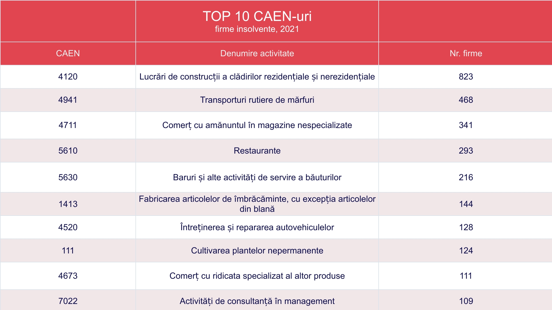 Vezi aici Top 5 CAEN – firme insolvente, pentru toate regiunile din România.