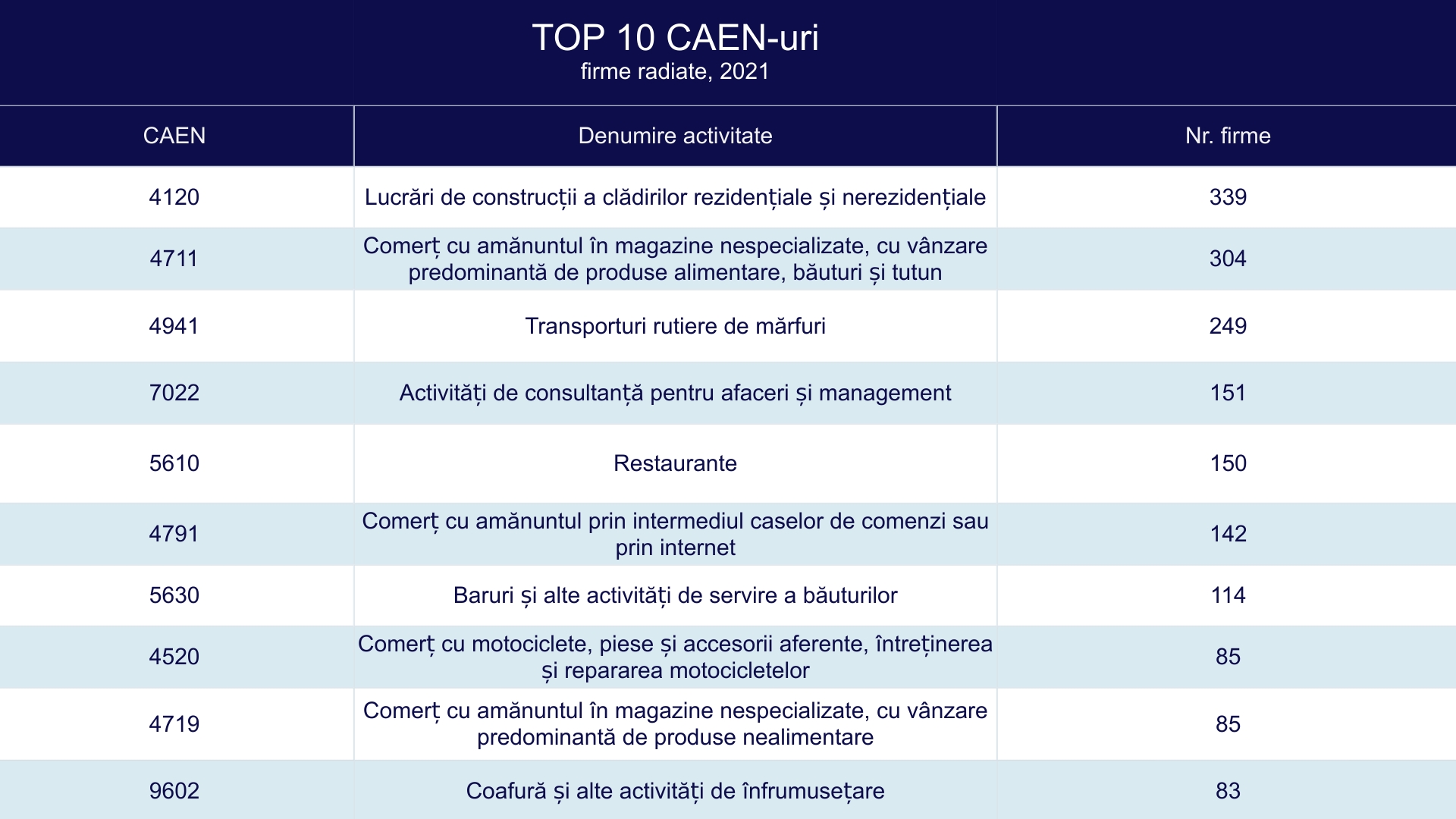 Tot firmele de construcții sunt pe primul loc și în topul celor radiate, urmate de cele care fac comerț cu amănuntul în magazine nespecializate, cu vânzare predominantă de produse alimentare, băuturi și tutun (CAEN 4711 ). Pe ultimul loc în top sunt firmele cu CAEN 9602 – coafură și alte activități de înfrumusețare.