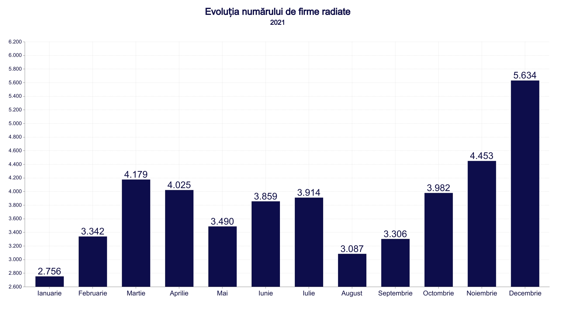 Din cele 46.027 de firme radiate în 2021, cele mai multe sunt în luna decembrie – 5.634 de societăți, urmată de noiembrie (4.453) și martie (4.179).