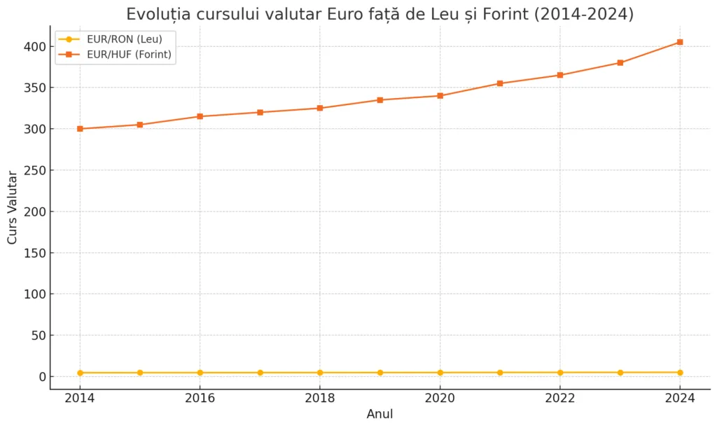 În ultimul deceniu, cursul de schimb al euro (EUR) față de leul românesc (RON) și față de forintul maghiar (HUF) a prezentat diferențe notabile în ceea ce privește stabilitatea și tendințele de depreciere.