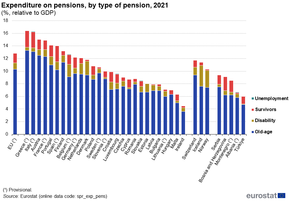 În 2021, aproximativ 1.882 miliarde de euro au fost cheltuite pe pensii în țările UE, adică 12,9% din produsul intern brut (PIB) total. Deși cheltuielile totale pentru pensii au crescut cu 2,8% comparativ cu 2020, raportul lor față de PIB a fost cu 0,7 puncte procentuale mai mic decât în 2020, când a fost de 13,6%.